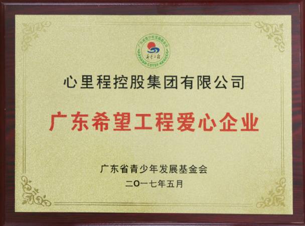 2017年5月【廣東省青少年發(fā)展基金會(huì)】授予【廣東心里程控股集團(tuán)】廣東希望工程愛心企業(yè)的稱號(hào)。