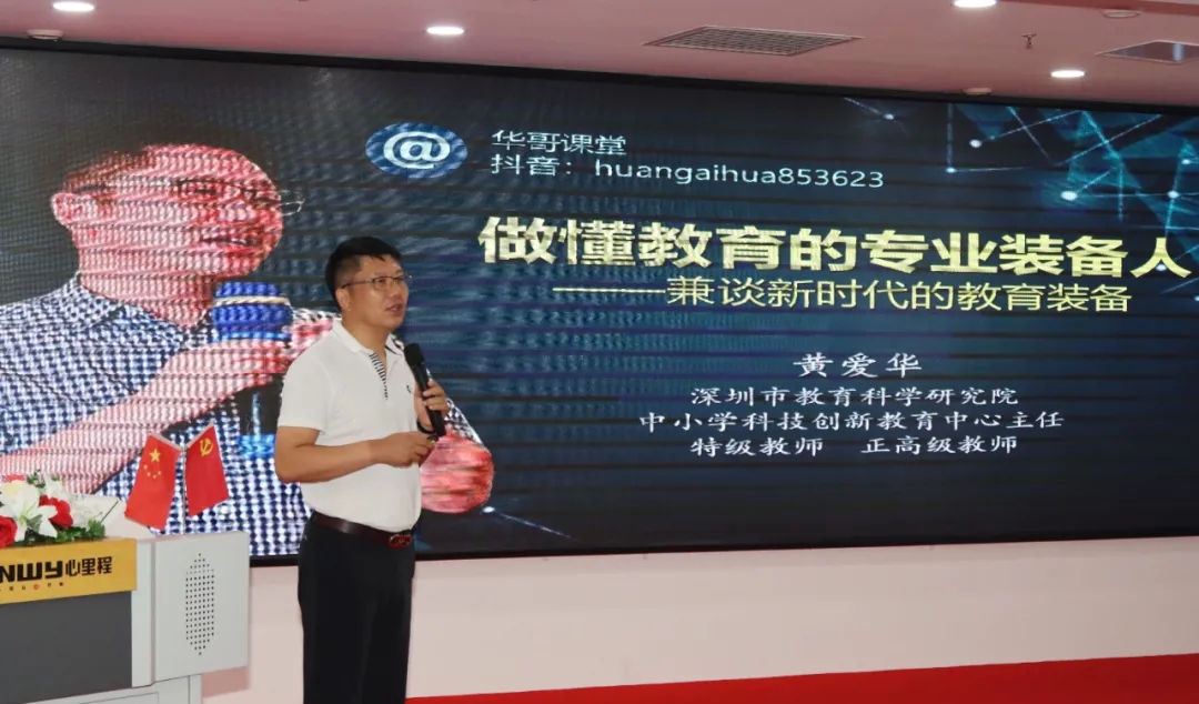集訓期間,集團有幸邀請到深圳市教育科學研究院中小學科技創(chuàng)新教育中心主任、特級教師、 正高級教師黃愛華,為集訓營干部作題為《做懂教育的專業(yè)裝備人——兼談新時代的教育裝備》的講座。
