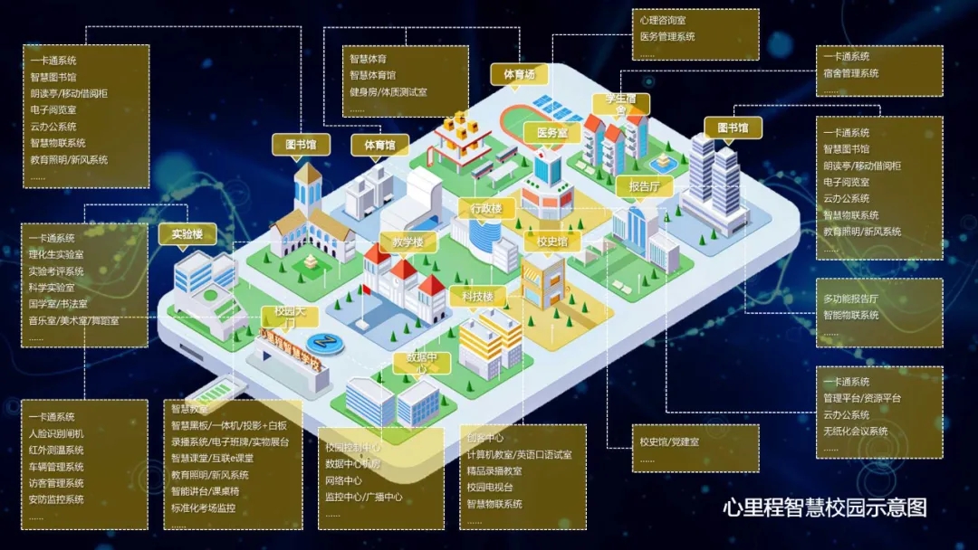 心里程智慧校園整體解決方案圍繞個(gè)性化學(xué)習(xí)困難、優(yōu)質(zhì)教師難以覆蓋所有學(xué)生、缺乏知識(shí)深度理解和探究必要手段、教學(xué)和管理調(diào)控困難等問題解決的實(shí)際需要,充分利用“互聯(lián)網(wǎng)+”、人工智能、虛擬仿真、云計(jì)算、大數(shù)據(jù)等技術(shù),從智慧教學(xué)環(huán)境、云端結(jié)合教學(xué)系統(tǒng)、智慧管理系統(tǒng)等方面建設(shè)、改進(jìn)、完善學(xué)校智慧校園,做到系統(tǒng)化、場(chǎng)景化、生態(tài)化、人性化、個(gè)性化。