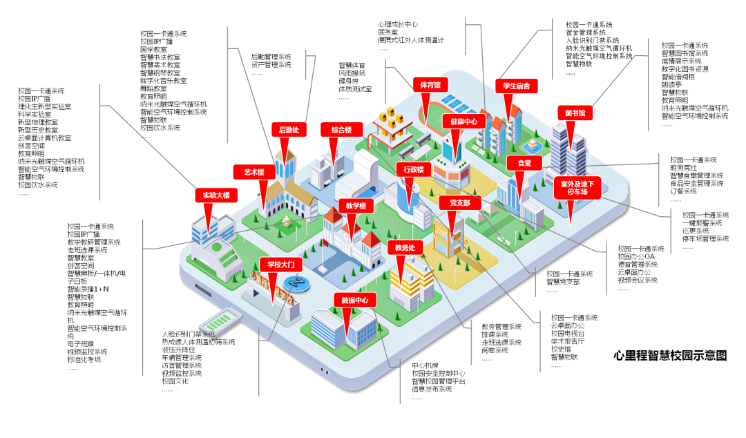 心里程自主研發(fā)的“智慧校園整體解決方案”,以校園活動(dòng)數(shù)據(jù)為基礎(chǔ),借力大數(shù)據(jù)、云計(jì)算、物聯(lián)網(wǎng)、人工智能、5G 等信息化技術(shù),將學(xué)校管理、教學(xué)、文化和生活等進(jìn)行充分融合。為學(xué)校教學(xué)、教研、管理和生活提供集智能感知、智能控制、智能管理、智能互動(dòng)、智能分析等功能于一體的完整解決方案,包括智慧教學(xué)、智慧管理、智慧生活、智慧文化和智慧環(huán)境等模塊。