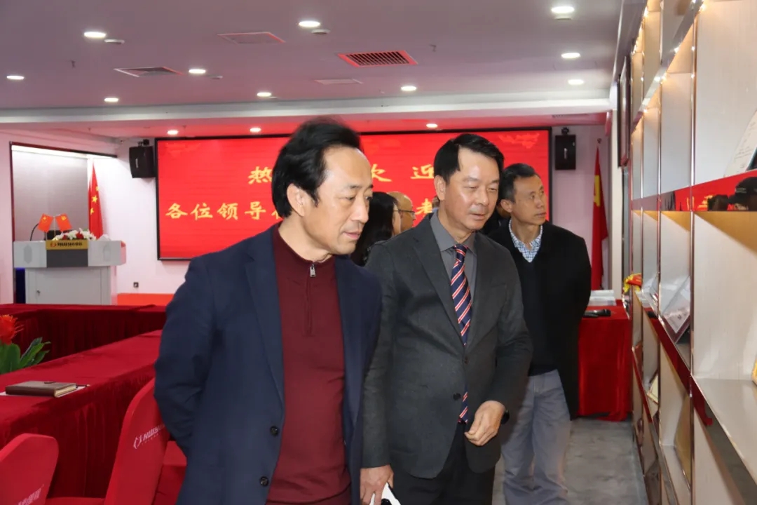 彭錦環(huán)總裁(前排右一)向南山區(qū)政協(xié)副主席、區(qū)教育局局長劉根平(前排右二)介紹心里程集團