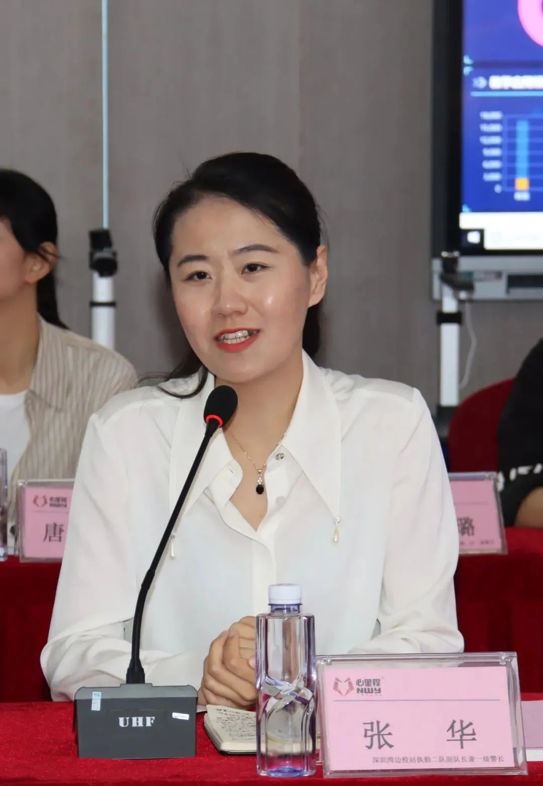 深圳灣邊檢站執(zhí)勤二隊黨總支副書記、隊長戴沛民,黨總支委員、副隊長趙勇等民警代表,心里程集團黨支部副書記王九強、總裁辦主任蘇冰、總裁助理張敏、優(yōu)秀女同志代表周育英、孔陸瑤、賴怡靜等參加座談。