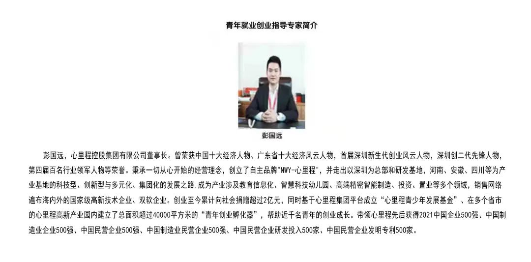 彭國遠董事長于2007年開始回國創(chuàng)業(yè),在上海注冊第一家公司,自留學歸國創(chuàng)業(yè)至今已有15年,擁有豐富的創(chuàng)業(yè)經(jīng)驗與閱歷,成熟穩(wěn)定的創(chuàng)業(yè)思維。早在2020年的時候就被聘為“全國人才流動中心高校畢業(yè)生就業(yè)創(chuàng)業(yè)指導專家”,并且曾應邀參加人社部就業(yè)促進司、全國人才流動中心和青海省人社廳聯(lián)合在青海民族大學舉辦高校畢業(yè)生就業(yè)創(chuàng)業(yè)指導進校園活動,為廣大畢業(yè)生作題為《在新時代創(chuàng)業(yè),需要注意什么》的專題講座;受邀到香港理工大學參加“創(chuàng)新、創(chuàng)業(yè)、創(chuàng)未來”交流會,與廣大師生分享自己創(chuàng)業(yè)以來的心路歷程及經(jīng)驗。