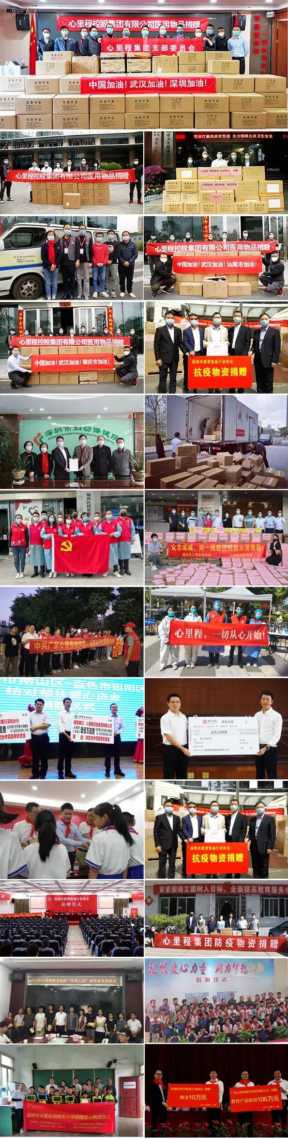 疫情時期及后疫情時期,心里程集團(tuán)積極承擔(dān)企業(yè)應(yīng)有的社會責(zé)任,接續(xù)為疫情防控增勁助力,為筑牢突發(fā)疫情防線貢獻(xiàn)力量,與各方抗疫力量共同奏響戰(zhàn)疫曲:先后為湖北武漢、廣東深圳、廣東肇慶、廣東汕尾送去醫(yī)用口罩、醫(yī)用手套、醫(yī)用護(hù)目鏡等物資50多萬套;作為深圳市教育裝備行業(yè)協(xié)會會長單位,積極組織“獻(xiàn)愛心,抗疫情”捐贈活動;作為廣東省商業(yè)創(chuàng)新創(chuàng)業(yè)聯(lián)合會會長單位,通過捐贈醫(yī)務(wù)用品、提供現(xiàn)金資助、派送新鮮水果、組織義工現(xiàn)場支援等多種方式,聯(lián)合廣大會員單位全面開展疫情防控助力工作。疫情發(fā)生以來,心里程集團(tuán)向全國捐資捐物價(jià)值近千萬元。此外,心里程集團(tuán)通過捐贈教學(xué)設(shè)備、設(shè)立貧困大學(xué)生獎學(xué)金、免費(fèi)提供輔導(dǎo)課程、打造創(chuàng)業(yè)孵化器等多種方式,助力青少年的教育、成長與創(chuàng)業(yè)。截至目前,集團(tuán)已累計(jì)向社會捐贈超2億元人民幣,并以突出貢獻(xiàn)躍居胡潤慈善榜百強(qiáng)企業(yè)、福布斯中國慈善榜百強(qiáng)企業(yè)等。
