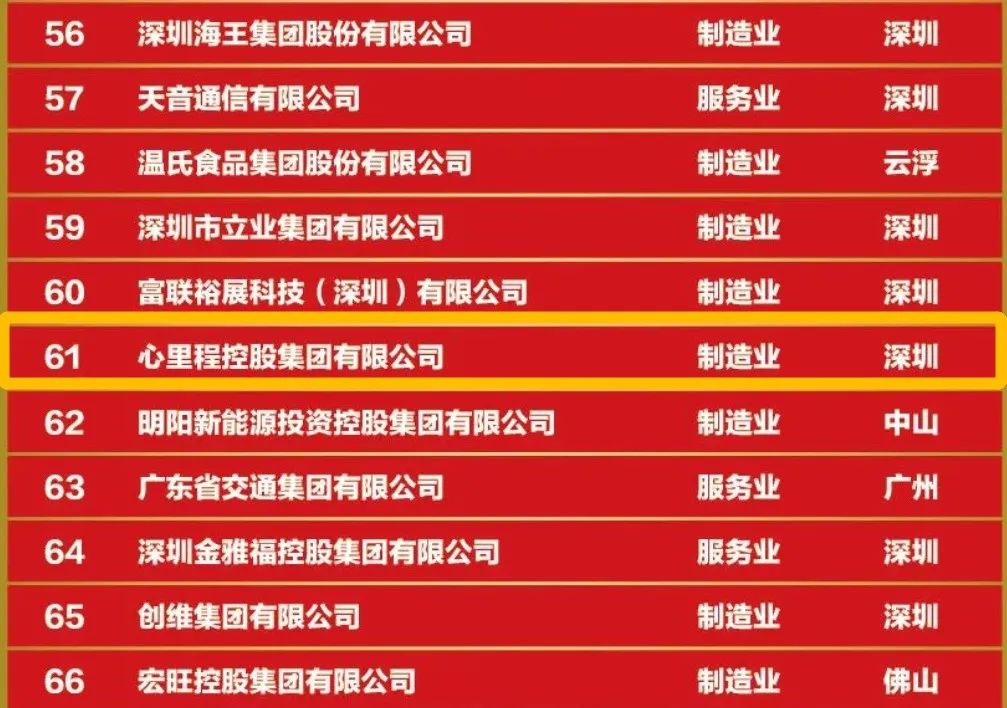 心里程集團(tuán)榮登“廣東制造業(yè)企業(yè)100強(qiáng)”榜單第23位