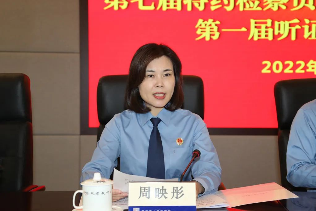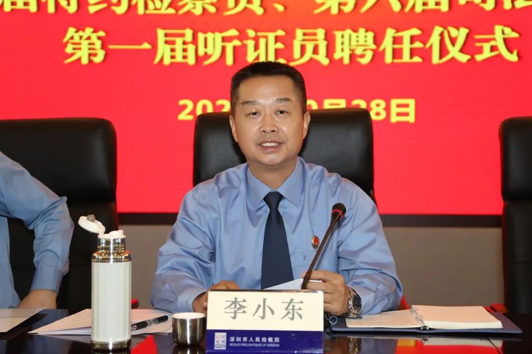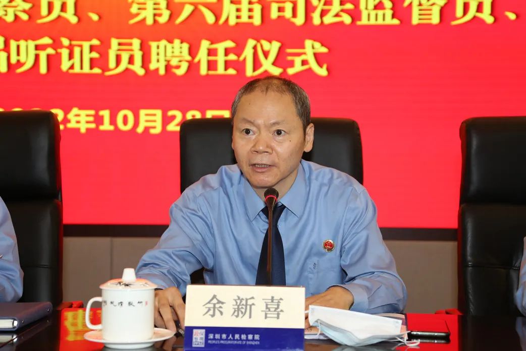 深圳市檢察院黨組副書記、副檢察長余新喜主持本次聘任儀式。他首先對各位來賓表示熱烈歡迎與衷心感謝,并說到,聘任特約檢察員、司法監(jiān)督員、聽證員是貫徹落實習近平法治思想、習近平總書記關于落實全過程人民民主以及加強和改進統(tǒng)一戰(zhàn)線工作重要思想的一項具體舉措,也是健全檢察外部監(jiān)督制約機制,深化司法改革,加強檢務公開的重要保證。