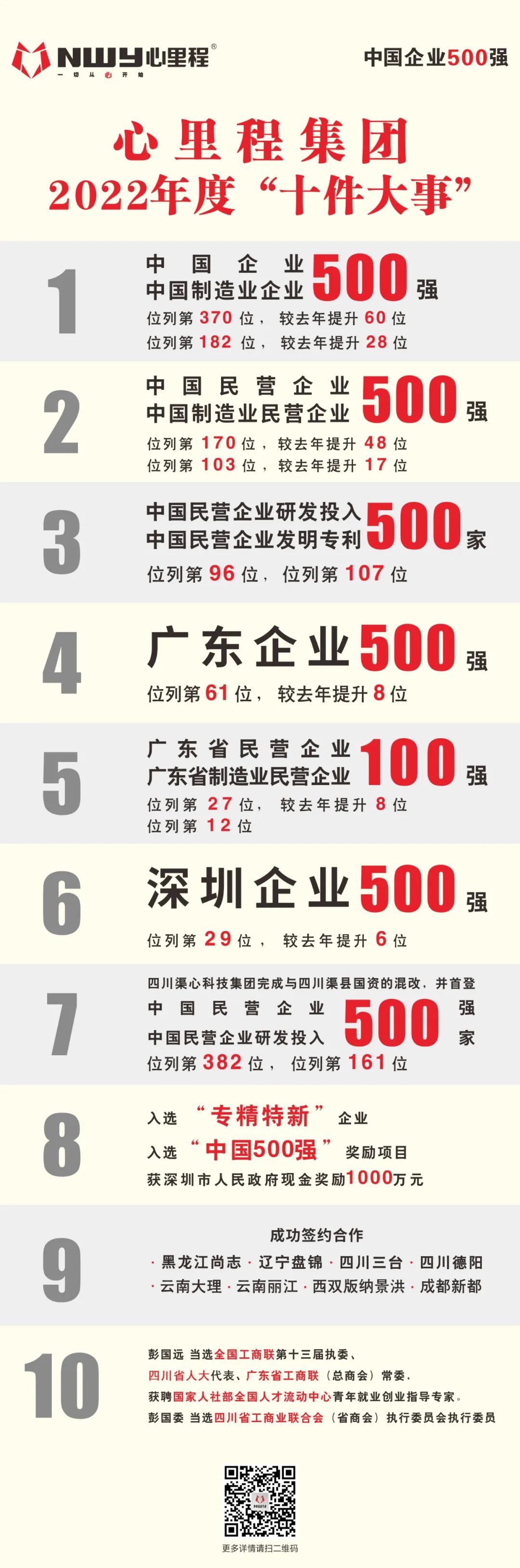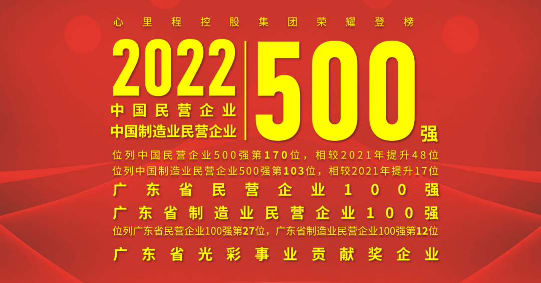 2022年是心里程集團碩果累累的一年,同年,心里程集團還榮登了“2022中國企業(yè)500強”榜單第370位、“2022中國制造業(yè)企業(yè)500強” 榜單第182位、“中國民營企業(yè)研發(fā)投入500家”榜單第96位、“中國民營企業(yè)發(fā)明專利500家”第107位、“2022廣東企業(yè)500強”榜單第61位、“2022深圳企業(yè)500強”榜單第29位。