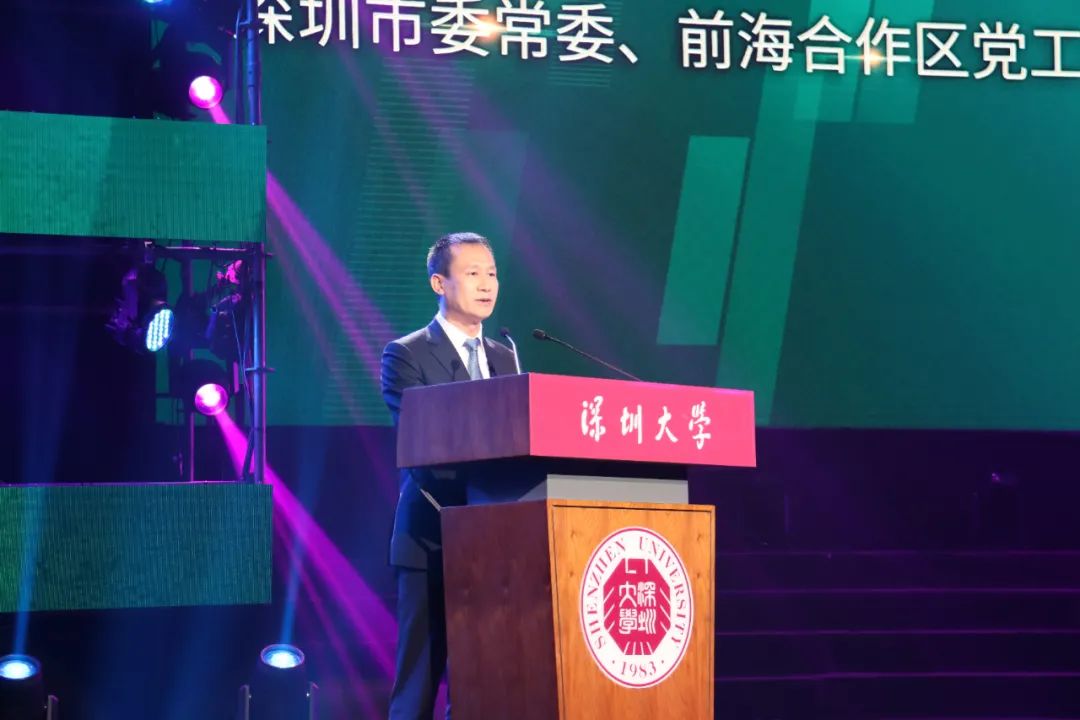 4月27日,深圳大學(xué)40周年校慶捐贈儀式暨“海岸之聲”音樂晚會在該校麗湖校區(qū)至?xí)丑w育館隆重舉行。 深圳大學(xué)杰出校友、深圳市委常委、前海合作區(qū)黨工委書記、南山區(qū)委書記曾湃,深圳大學(xué)黨委書記李清泉,深圳大學(xué)校長、中國科學(xué)院院士毛軍發(fā)等領(lǐng)導(dǎo),以及杰出校友代表、企業(yè)界代表、師生代表共1400余人參加儀式。副校長李永華主持捐贈儀式。心里程集團(tuán)董事長彭國遠(yuǎn)受邀出席活動并代表集團(tuán)捐資1億元。