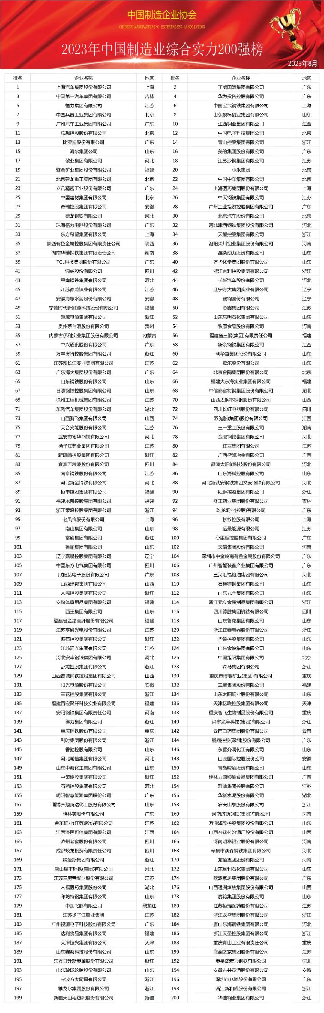 近日,中國(guó)制造企業(yè)協(xié)會(huì)發(fā)布2023年中國(guó)制造業(yè)綜合實(shí)力200強(qiáng)(下稱“200強(qiáng)榜單”)暨中國(guó)裝備制造業(yè)100強(qiáng)(下稱“100強(qiáng)榜單”)排行榜。200強(qiáng)榜單中,廣東有22家企業(yè)上榜,僅次于山東(30家)、浙江(29家),排名第三。