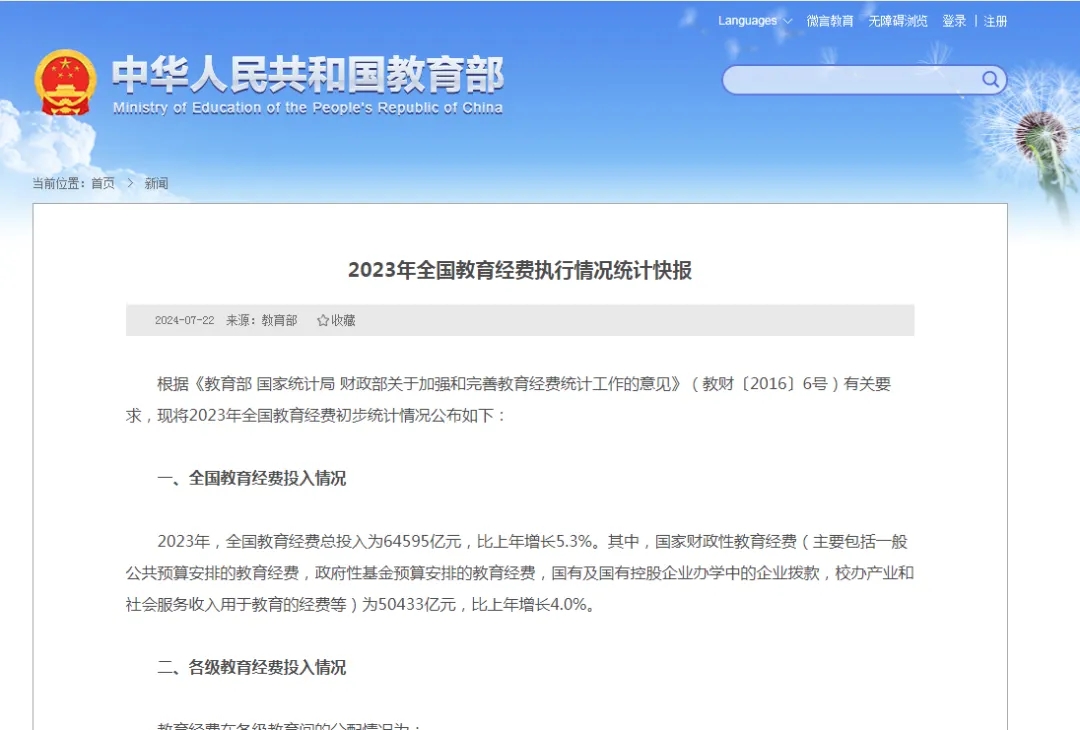 7月22日,教育部公布2023年全國教育經(jīng)費執(zhí)行情況統(tǒng)計快報。