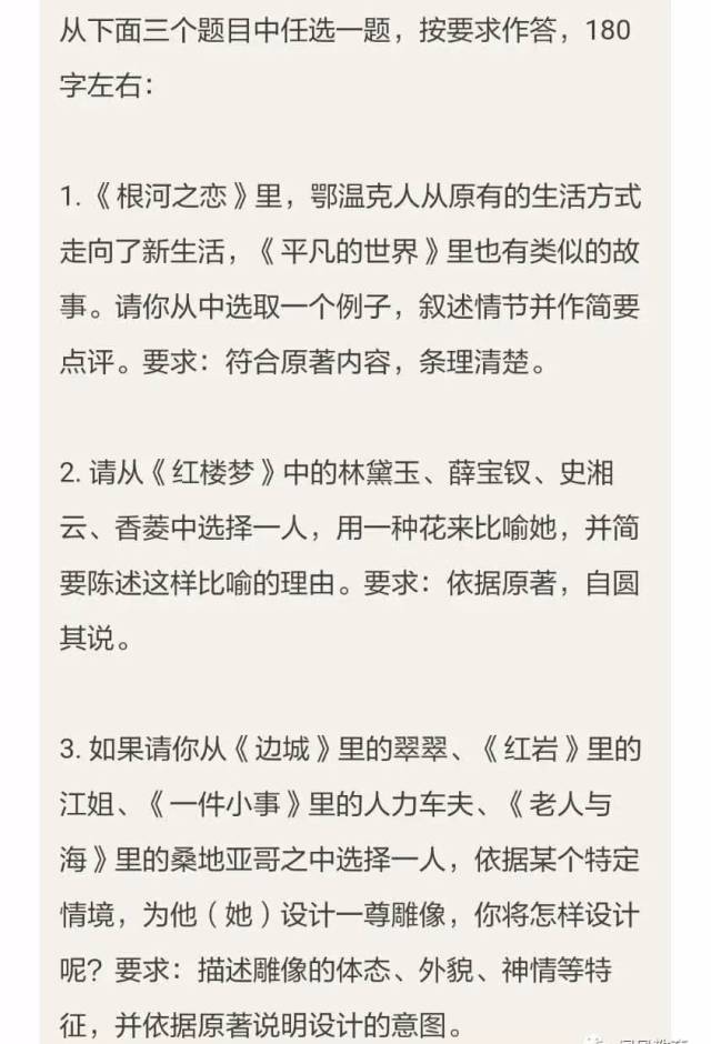 改變中國高考幾十年來文理分科帶來的偏科、知識面狹窄、過早抑制學(xué)生可塑性等的嚴(yán)重弊端,從幼升小一直到高考更大地鼓勵每個學(xué)生增加各學(xué)科知識的寬度、廣度而不是深度,從而最大限度地提升全體學(xué)生的廣泛閱讀水平,讓每個學(xué)生在全程12年的基礎(chǔ)教育中逐步建立感興趣的學(xué)科方向。高質(zhì)量的閱讀需要高水平的語文學(xué)習(xí),語文重點突出中國優(yōu)秀傳統(tǒng)文化。今天中午剛結(jié)束的北京高考語文,有一道小作文題,如下圖。