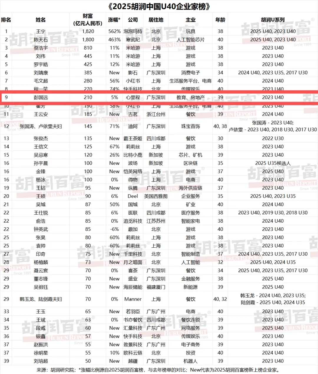 本報(bào)告也包括《2025胡潤(rùn)中國(guó)U40企業(yè)家榜》,39位個(gè)人財(cái)富50億元及以上的U40企業(yè)家上榜。心里程控股集團(tuán)創(chuàng)始人?董事長(zhǎng)彭國(guó)遠(yuǎn)榮登該榜單,位列第9位。這一成績(jī)不僅是對(duì)彭國(guó)遠(yuǎn)董事長(zhǎng)個(gè)人在商業(yè)領(lǐng)域不斷探索與努力的肯定,也體現(xiàn)了心里程控股集團(tuán)在行業(yè)內(nèi)的持續(xù)發(fā)展與進(jìn)步。