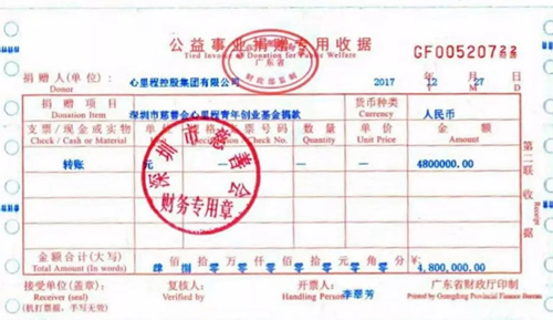 2018新年伊始,心里程控股集團(tuán)接收到了深圳慈善會(huì)開具的捐贈(zèng)發(fā)票及其頒發(fā)的捐贈(zèng)證書,這是“深圳市慈善會(huì)·心里程青年創(chuàng)業(yè)基金”成立以來,心里程集團(tuán)向深圳慈善會(huì)捐贈(zèng)的首筆款項(xiàng)。