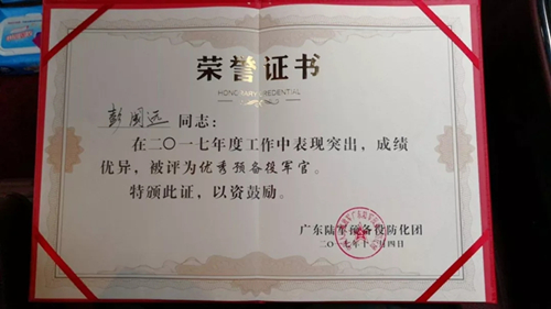 2016年,彭國遠(yuǎn)董事長被編入中國人民解放軍廣東陸軍預(yù)備役。經(jīng)過組織的認(rèn)真考察,他成為了一名光榮的陸軍預(yù)備役軍官,這圓了他兒時綠色軍營的夢想。