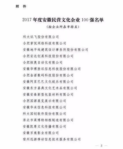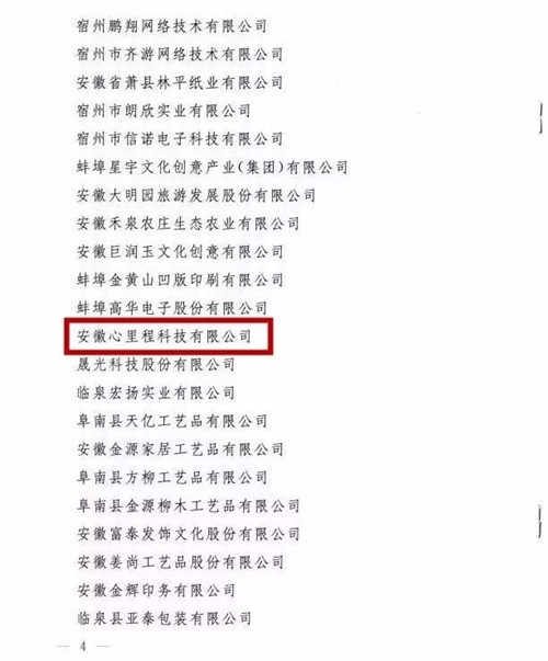 根據(jù)中共安徽省委宣傳部、安徽省文化廳、安徽省新聞出版廣電局《關(guān)于公布“2017年度安徽民營文化企業(yè)100強(qiáng)”名單的通知》(皖宣通字﹝2018﹞19號(hào))的文件,安徽心里程科技有限公司成功入選“2017年度安徽民營文化企業(yè)100強(qiáng)”