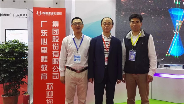 深圳市教育局發(fā)展規(guī)劃與財務管理處處長薛運琪(中)、教育信息技術中心主任、育新學校校長楊煥亮(右)參觀考察心里程展位