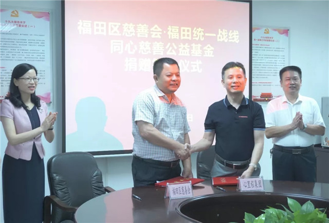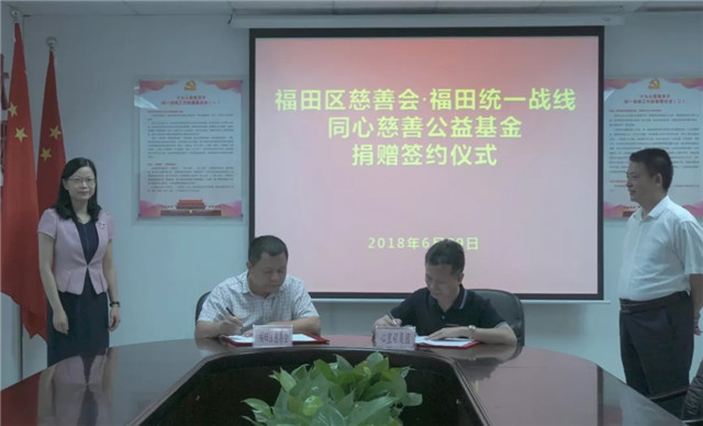 啟動儀式開始前,在福田區(qū)委常委、統(tǒng)戰(zhàn)部長劉俊琳,福田區(qū)委統(tǒng)戰(zhàn)部常務(wù)副部長朱亞銘,福田區(qū)民政局副局長呂凡,福田區(qū)慈善會秘書長楚天等領(lǐng)導(dǎo)的見證下,彭俏奇董事長與福田區(qū)慈善會會長莊儒平正式簽署捐贈協(xié)議。
