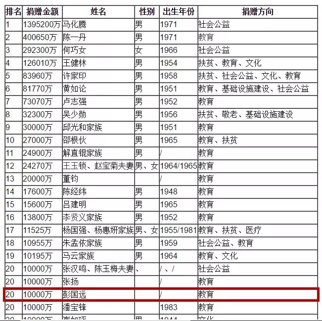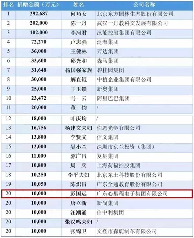榜單上顯示,心里程控股集團董事長彭國遠以2000萬元的現(xiàn)金捐贈榮登慈善榜第75位。
