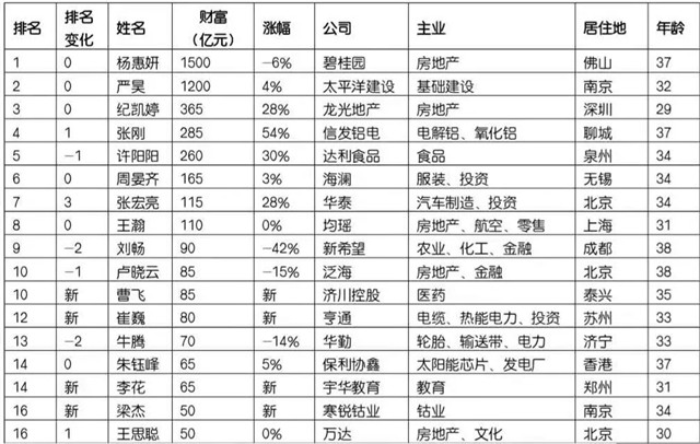 · 前兩名都來(lái)自世界500強(qiáng)企業(yè):碧桂園的楊惠妍和太平洋建設(shè)的嚴(yán)昊。
