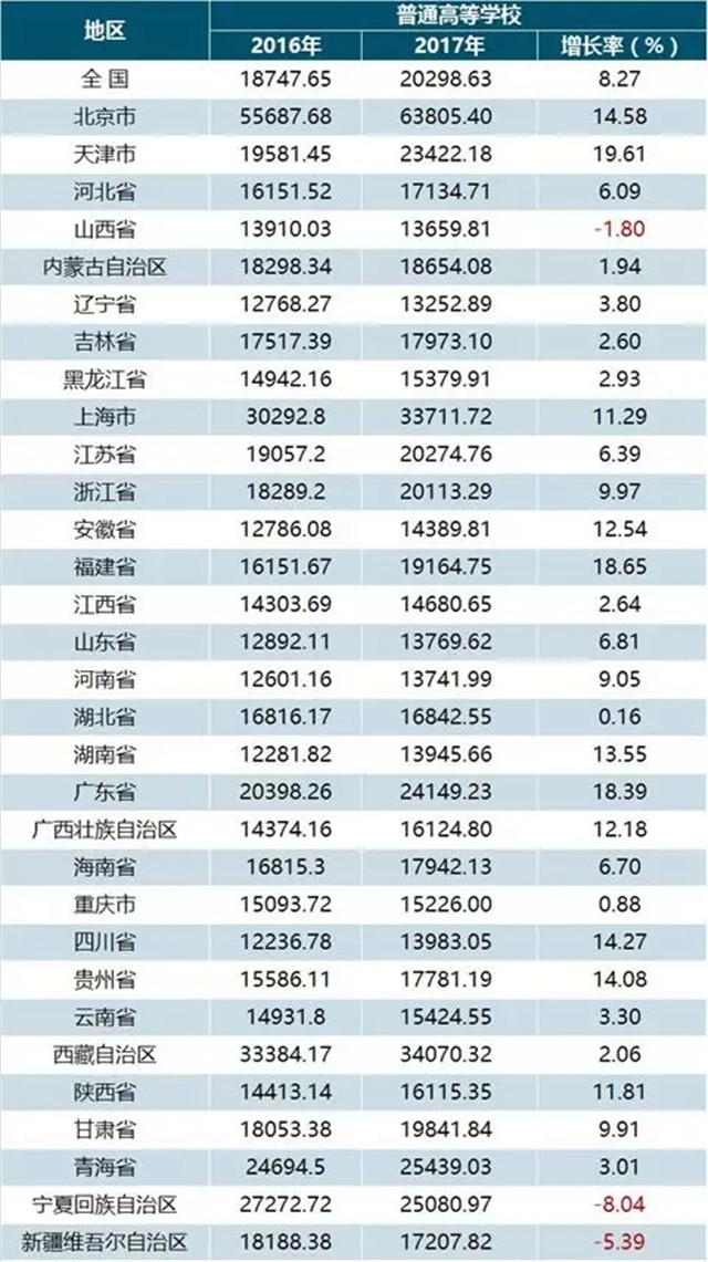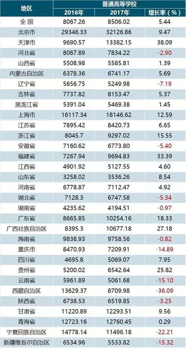 從普通高校來(lái)看,2017年全國(guó)普通高校一般公共預(yù)算教育事業(yè)費(fèi)為20298.63億元,較上年增長(zhǎng)8.27%,增長(zhǎng)最快的是天津市(19.61%);2017年全國(guó)普通高等學(xué)校一般公共預(yù)算公用經(jīng)費(fèi)支出為8506.02元,比上年的8067.26元增長(zhǎng)5.44%。增長(zhǎng)最快的是天津市(38.09%)。