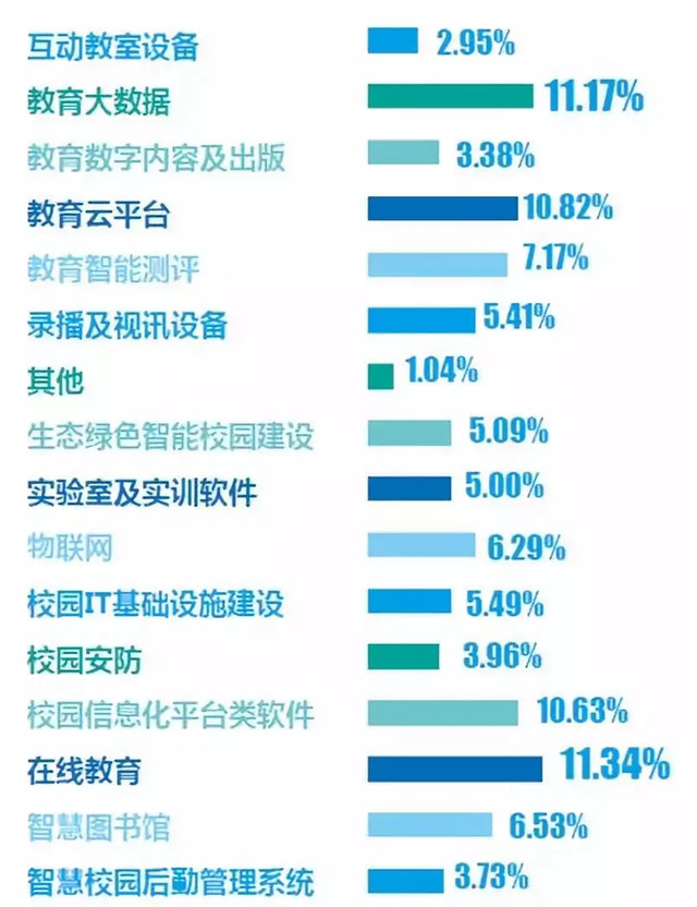 通過(guò)教育科技產(chǎn)品變革趨勢(shì)調(diào)研數(shù)據(jù)以及對(duì)全國(guó)多地的教育領(lǐng)導(dǎo)、專(zhuān)家學(xué)者、各級(jí)院校校長(zhǎng)老師等維度的觀眾調(diào)研數(shù)據(jù),可以預(yù)測(cè)2019年信息化建設(shè)投入方向。在線(xiàn)教育與教育大數(shù)據(jù)占比最高,分別為11.34%與11.17%,緊隨其后為教育云平臺(tái)占比10.82%,校園信息化平臺(tái)類(lèi)軟件占比10.63%。