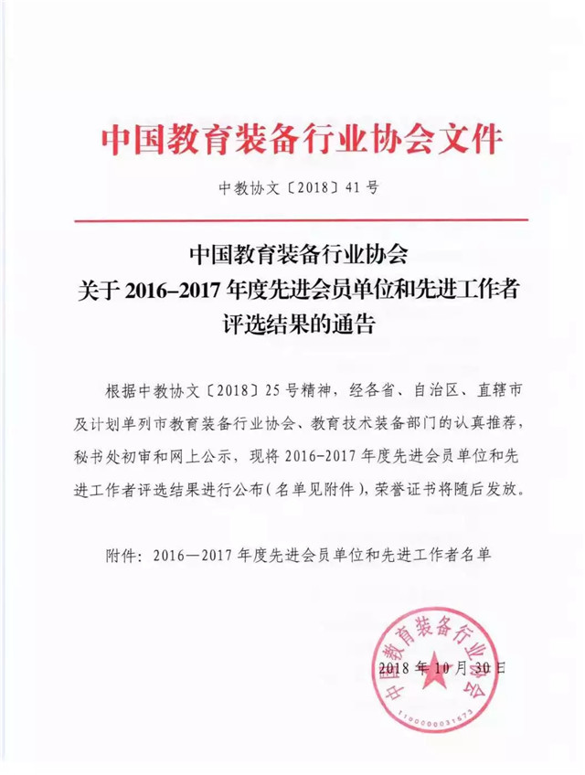 根據(jù)中教協(xié)文〔2018〕25號精神,經(jīng)各省、自治區(qū)、直轄市及計劃單列市教育裝備行業(yè)協(xié)會、教育技術(shù)裝備部門的認(rèn)真推薦,秘書處初審和網(wǎng)上公示,現(xiàn)將2016-2017年度先進(jìn)會員單位和先進(jìn)工作者評選結(jié)果進(jìn)行公布(名單見附件),榮譽(yù)證書將隨后發(fā)放。