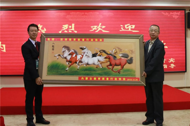 會(huì)后,內(nèi)蒙古教育裝備行業(yè)協(xié)會(huì)考察團(tuán)向深圳教育裝備行業(yè)協(xié)會(huì)贈(zèng)送《八駿圖》,彭錦環(huán)總裁、會(huì)長(zhǎng)代表協(xié)會(huì)接受禮物,并回贈(zèng)協(xié)會(huì)紀(jì)念品以表達(dá)謝意。