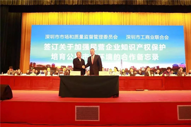 市市場監(jiān)管委黨組成員、市場監(jiān)管局副局長夏昆山與市工商聯(lián)主席、市總商會會長陳志列分別代表兩家單位簽署《市市場監(jiān)管委、市工商聯(lián)關于加強民營企業(yè)知識產(chǎn)權保護培育公平市場環(huán)境的合作備忘錄》,雙方將在知識產(chǎn)權培訓、業(yè)務指導、加大知識產(chǎn)權維權力度、促進知識產(chǎn)權運營孵化等四大方面進行深度合作。
