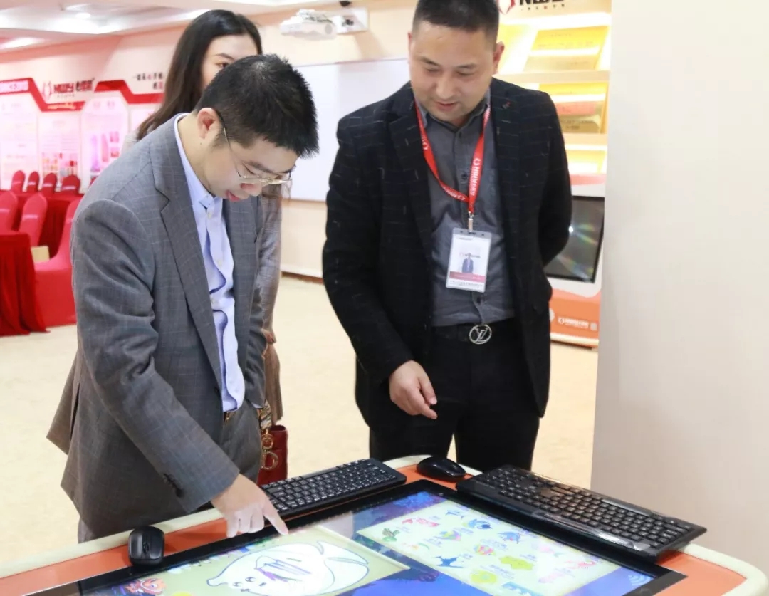 心里程投資集團張玉常務副總裁(右一)陪同黃仕坤會長一行體驗心里程幼教系列產(chǎn)品