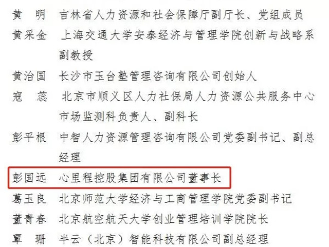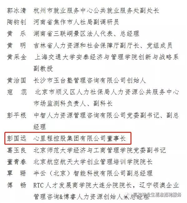 為進一步健全和完善高校畢業(yè)生就業(yè)創(chuàng)業(yè)服務體系,充分發(fā)揮專家團隊在就業(yè)創(chuàng)業(yè)服務領(lǐng)域的積極作用,更好地為高校畢業(yè)生提供多方位指導和精細化服務,提升其就業(yè)創(chuàng)業(yè)競爭力,促進更加充分和更高質(zhì)量就業(yè),日前,人力資源社會保障部全國人才流動中心公布了68位全國人才流動中心高校畢業(yè)生就業(yè)創(chuàng)業(yè)指導專家的名單,心里程控股集團董事長彭國遠入選。