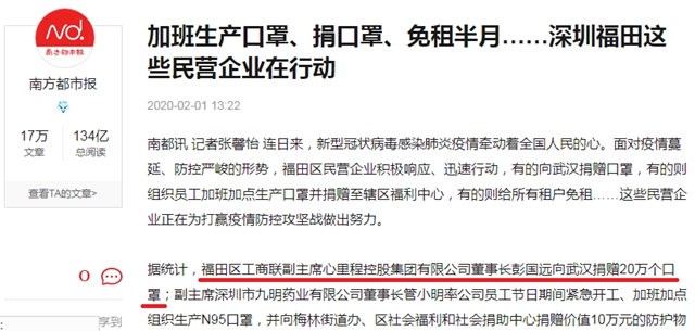 1月底,深圳市福田區(qū)工商聯(lián)副主席、心里程控股集團(tuán)有限公司董事長(zhǎng)彭國(guó)遠(yuǎn)向武漢捐贈(zèng)口罩20萬個(gè)。