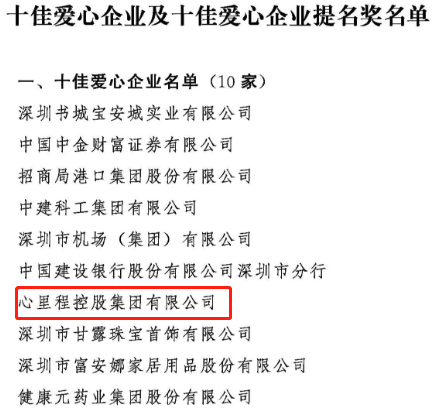 6月5日,經(jīng)第十七屆深圳關(guān)愛(ài)行動(dòng)系列推選活動(dòng)終評(píng)會(huì)評(píng)審,第十七屆深圳關(guān)愛(ài)行動(dòng)先進(jìn)集體、先進(jìn)個(gè)人和優(yōu)秀項(xiàng)目評(píng)審結(jié)果正式出爐,心里程控股集團(tuán)獲評(píng)“十佳愛(ài)心企業(yè)”。